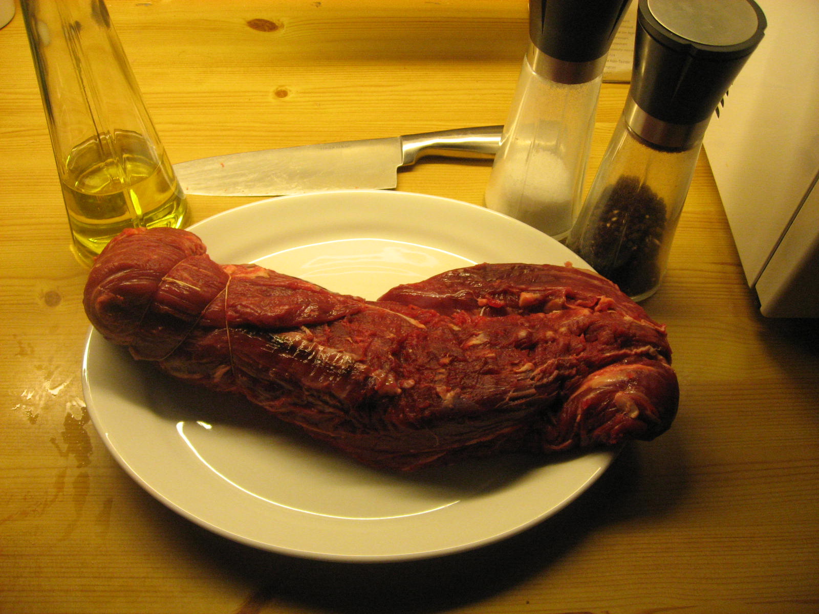 Vi startet med å renskjære fileten og pensle den med olivenolje. Deretter krydret vi med salt og pepper. Den tynneste delen ble knytt opp med hyssing for å få jevn tykkelse på biffen.